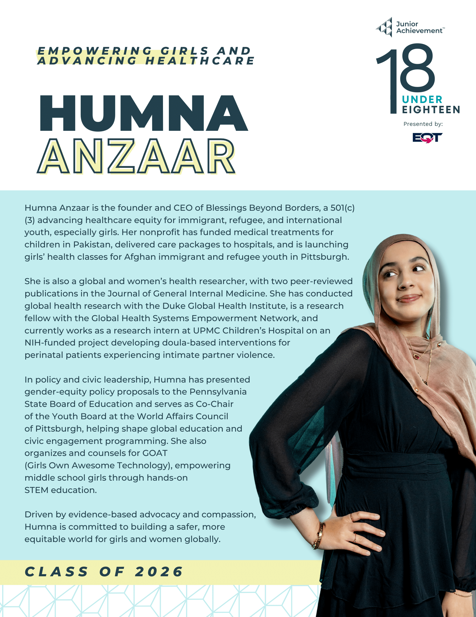 Honorees (individual and teams) will also be required to attend JA’s 18 Under Eighteen Presented by the EQT Foundation reception event scheduled for February 6, 2026.